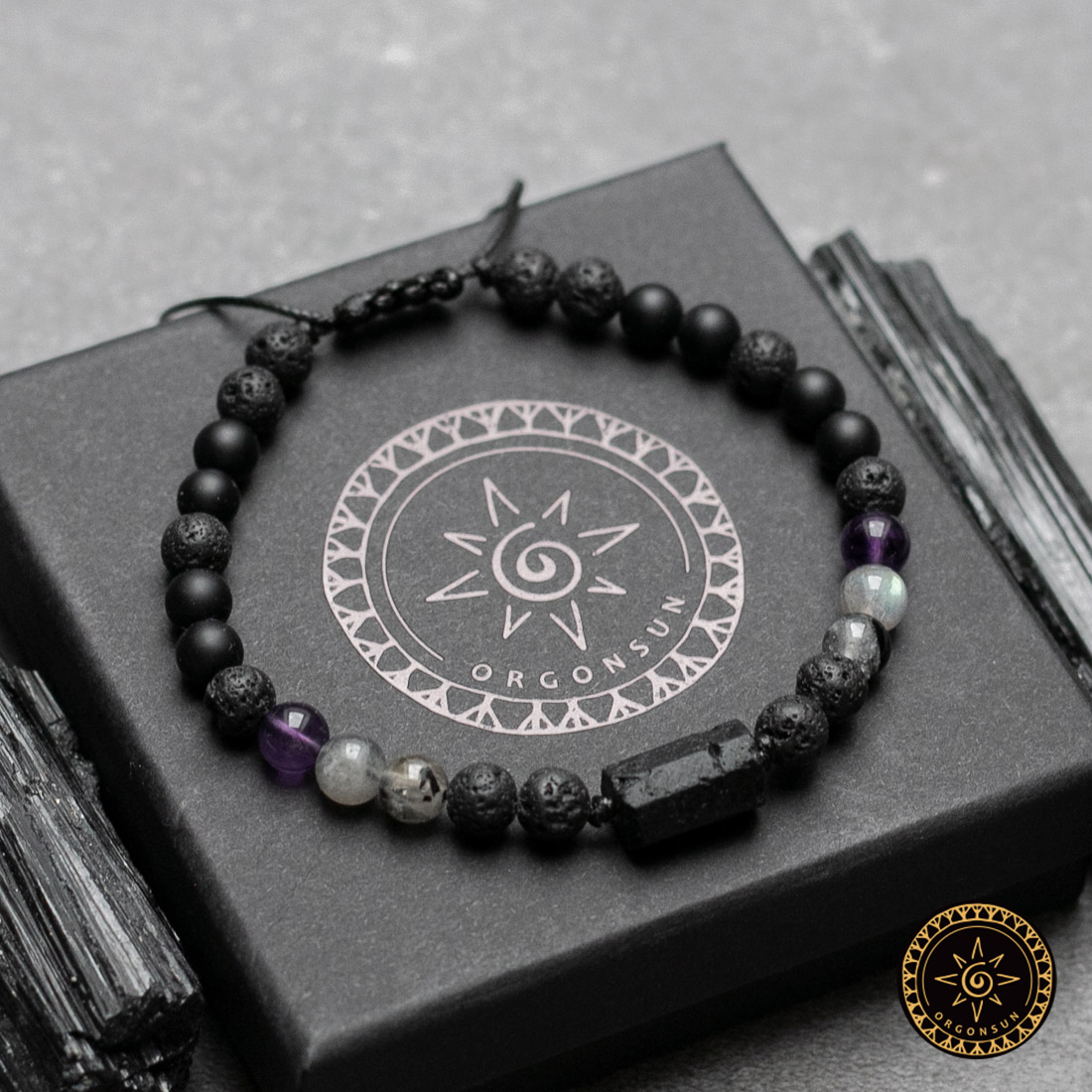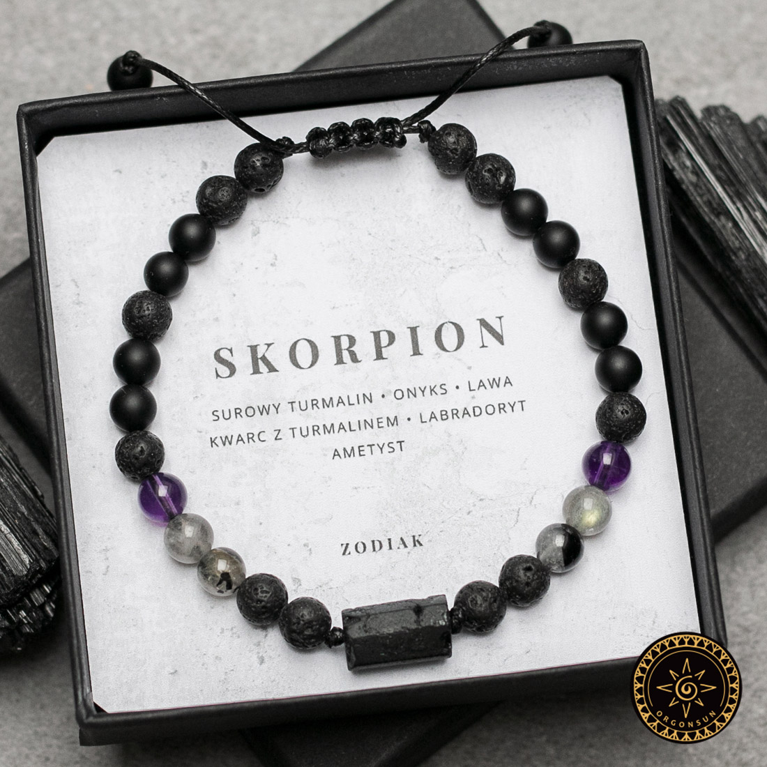 Kamienie naturalne: Surowy Turmalin – Bryła, Kwarc z Turmalinem, Labradoryt, Ametyst, Onyks i Kamień Wulkaniczny o średnicy 6 mm. Są to kamienie naturalne dlatego kamienie mogą różnić się nieznacznie wyglądem.